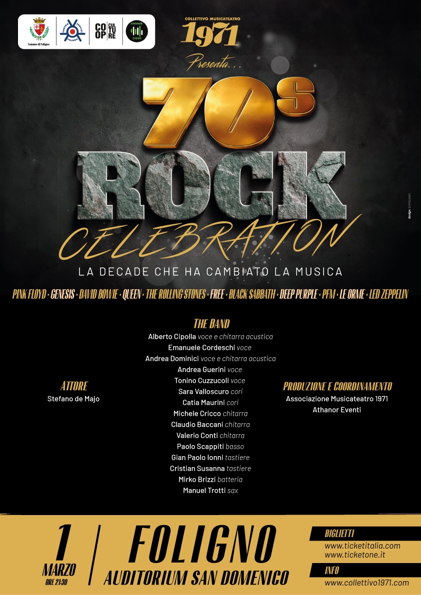 Tutto questo è l’evento “70’s Rock Celebration”, il titolo del prossimo appuntamento sabato 1 marzo (ore 21, biglietti in prevendita nei circuiti Ticket Italia e Ticket One) all’Auditorium San Domenico per il cartellone di eventi “Foligno On Stage” (ideato e organizzato da Athanor Eventi, in collaborazione con Coop Culture, Centro Servizi Foligno e Comune di Foligno).