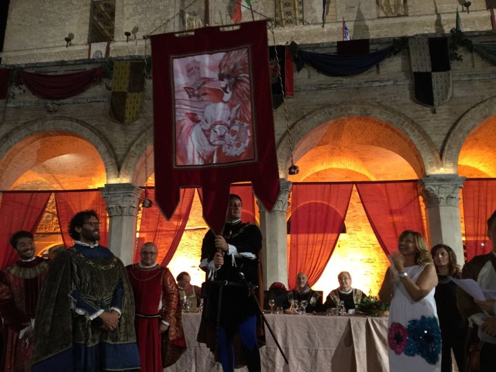 Gran finale con la presentazione del palio della Fuga del Bove realizzato da Daniele Procacci, che è stato dipinto con il vino Sagrantino e che racchiude gli elementi della terra di Montefalco: il bove, il falco e sullo sfondo la torre orologio che è l’ingresso della città.