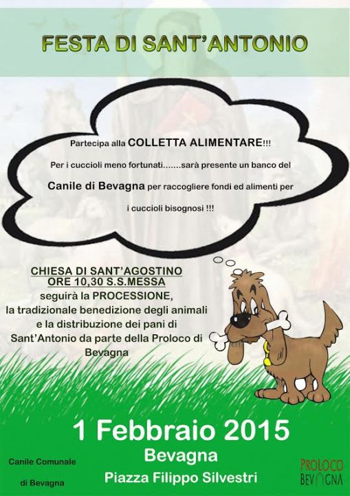 ”Da noi a Bevagna la festa di Sant’Antonio dura dal 17 gennaio al 1 febbraio” sostengono ironicamente i cittadini del centro a cui quest’anno è toccato in sorte di dover aspettare ben quindici giorni e due benedizioni precedenti prima di vedere per le strade del borgo il santo benedicente col suo seguito di festanti amici a quattro zampe. Ebbene sì, tra centro e frazioni la benedizione degli animali s’è triplicata….come dice il proverbio “melius abundare quam deficere”. La Proloco dal canto suo, conferma l’attenzione alle tradizioni con la distribuzione delle roccette in piazza a fine processione, ma quest’anno, come segno tangibile di apertura ai temi dell’ambiente e della sensibilità verso gli amici animali, promuove in collaborazione con il canile di Bevagna una colletta alimentare per i piccoli randagi. Invita quindi i concittadini a partecipare alla raccolta e a farsi promotori di una cultura e di una sensibilità rinnovate, a tenere alta la guardia, a denunciare episodi di maltrattamento. E citando Margherita Hack, “Gli animali son creature di questa terra, sono nostri fratelli e quindi non è che si devon considerare oggetti a nostra disposizione. Sono esseri viventi che hanno capacità di amare e di soffrire e quindi dobbiamo trattarli proprio come fratelli, come fratelli minori. Noi abbiamo un cervello più potente, però non vuol dire che, per questo, dobbiamo abusare di loro”.