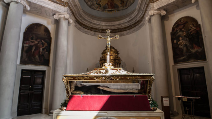 Rinnovato l’abito monacale domenicano, coperto il teschio con una maschera d’argento, frutto di un attento studio sulla ricostruzione facciale, il beato Giacomo è di nuovo apparso alla gente di Bevagna dall’interno della sua urna.