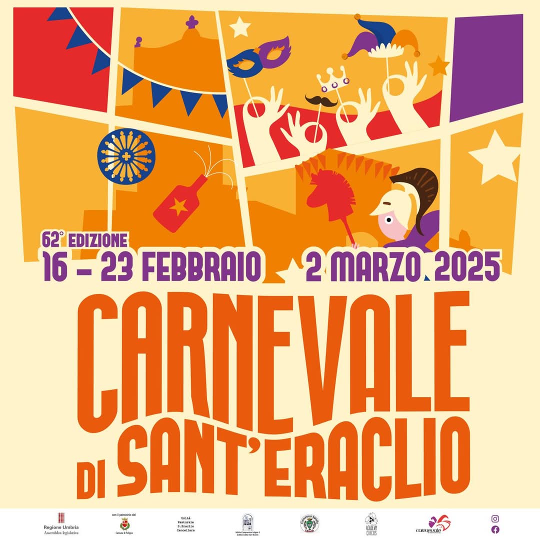 Oltre al patrocinio del Comune di Foligno e la presenza degli enti fondatori e sostenitori della rassegna (Unità Pastorale Sant’Eraclio – Cancellara”, Istituto statale comprensivo “Foligno 3 – Galilei”, Comunanza Agraria di Sant’Eraclio) e al Carnevale e l’Academy Circus, da quest’anno c’è un logo in più nel manifesto. Si tratta dell’Assemblea Legislativa della Regione dell’Umbria che per il 2025 ha concesso il patrocinio oneroso deliberando di concorrere alla realizzazione dell’iniziativa autorizzando l’importo di 1.000 euro e l’uso del logo per la 62esima edizione. Una estrema soddisfazione per l’ente presieduto da Fabio Bonifazi in quanto l’Assemblea Legislativa riconosce ufficialmente il ruolo di una manifestazione celebre e popolare nel territorio regionale promotrice di cultura e di artigianato creativo attraverso l’impiego dell’arte della cartapesta che riesce a tramandare alle nuove generazioni.