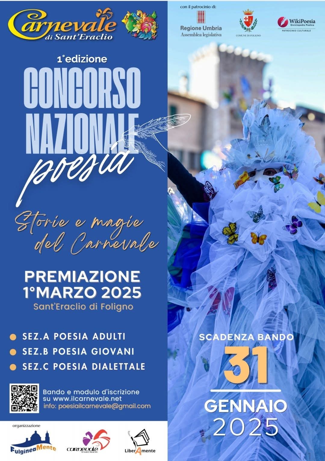 La giovane “graphic designer” Chiara Capitini è anche l’autrice della campagna di sensibilizzazione sui social per la ricerca di volontari per la realizzazione dei carri allegorici con lo slogan “Diventa protagonista del Carnevale Unisciti a noi”. E’ stata prorogata la scadenza del bando del concorso nazionale di poesia “Storie e magie del Carnevale” fissata per il 31 gennaio. L’iniziativa è stata organizzata collegialmente oltre che dal Carnevale anche dalle associazioni FulgineaMente e LiberAmente e si fregia del patrocinio culturale dell’enciclopedia poetica WikiPoesia. Tre le categorie poesia adulti, poesia giovani e poesia dialettale. Per chi fosse interessato può visionare il bando e il modulo d’iscrizione su www.ilcarnevale.net