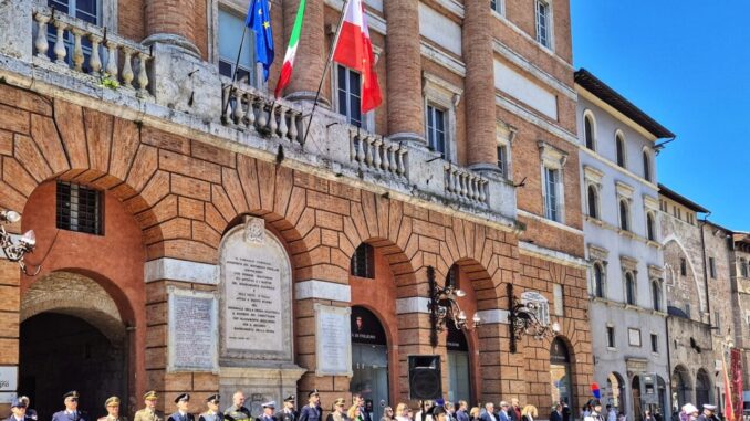 Il cuore delle celebrazioni si è poi spostato in Piazza della Repubblica. Qui sono state deposte corone d’alloro alla lapide dei caduti sulla facciata della cattedrale di San Feliciano e sul palazzo comunale. Presente anche il picchetto d’onore del centro di selezione e reclutamento nazionale dell’esercito.
