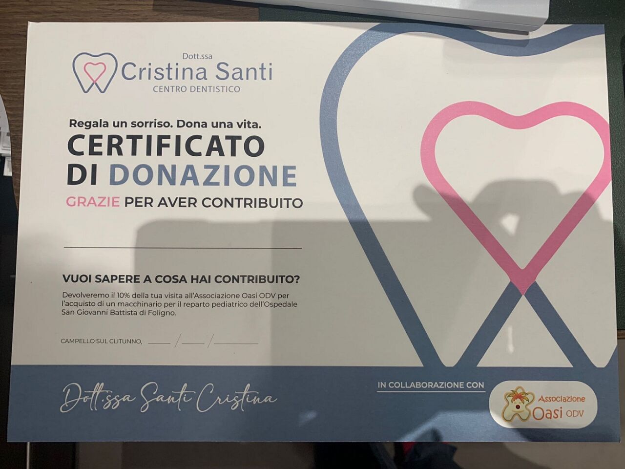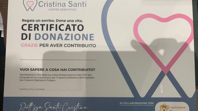 Trasformare la visita dal dentista, solitamente uno spauracchio per tutti i bambini, in un gioco e in un momento di solidarietà, devolvendo parte del ricavato della prima visita all’associazione L’Oasi, per l’acquisto di un monitor multiparametrico per la Pediatria dell’ospedale San Giovanni Battista di Foligno. In questo è riuscita la dottoressa Cristina Santi, titolare del “Centro dentistico Cristina Santi”, arrivato a contare 15 dipendenti totali e cinque poltrone.