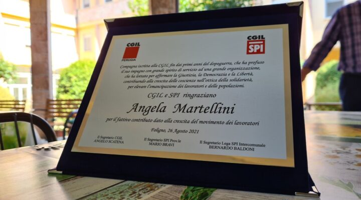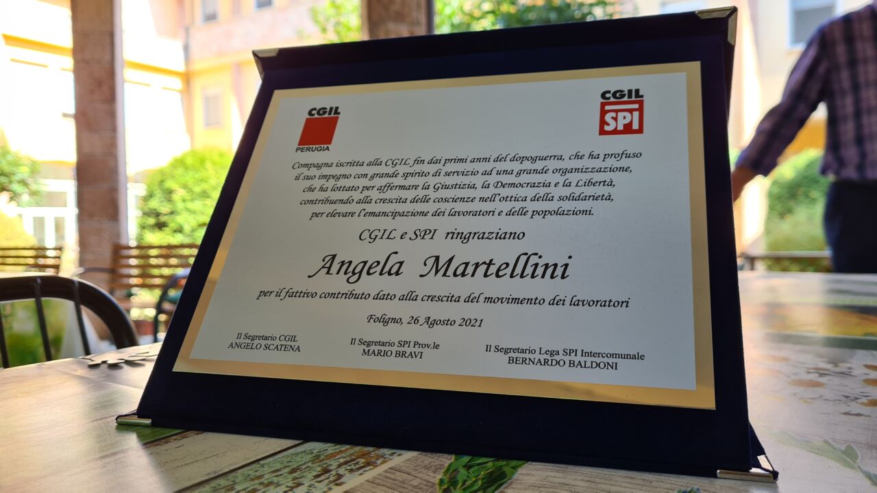 “Prima come maestra e poi come pensionata dal dopoguerra hai sempre continuato a contribuire insieme alla la tua Cgil alla crescita del movimento dei lavoratori – hanno detto porgendo il riconoscimento Mario Bravi dello Spi Cgil di Perugia, Angelo Scatena, della Camera del Lavoro, Dino Baldoni, Giuseppina Nataletti e Francesca Gianformaggio della Lega pensionati di Foligno – per questo ti siamo grati e continueremo insieme a batterci per gli ideali comuni: giustizia, democrazia e libertà”.