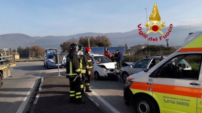 Incidente a Sant’Eraclio, due feriti lievi, auto distrutte Incidente stradale nei pressi di Sant’Eraclio. E’ accaduto intorno alle 14 di oggi all’uscita della ss3. Due le vetture coinvolte, feriti lievi. Sul posto è intervenuta una squadra dei vigili del fuoco del distaccamento di Foligno, la Croce Bianca di Foligno e la polizia.