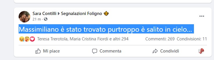 Massimiliano è stato trovato purtroppo è salito in cielo…, lo ha annunciato poco fa sui social la sorella Sara. Massimiliano Contilli, 43 anni, era scomparso da casa il 10 di agosto scorso. Intorno alle 14.30 si era recato in banca, dove aveva ritirato 100 euro. Poi di lui più nessuna traccia. L’uomo non aveva portato con sé il telefono cellulare, quindi le ricerche, eseguite dai carabinieri, sono state molto difficoltose vista l’impossibilità di localizzare il segnale. A lanciare l’allarme, sui social, la sorella Sara che aveva postato le foto del fratello.