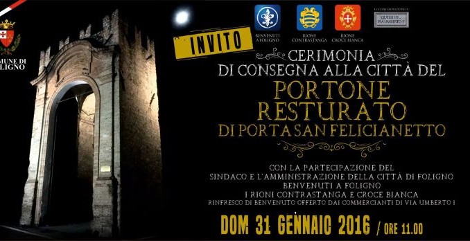 Tra gli interventi realizzati anche la pulitura, la lavatura, lo sgrassaggio e la rimozione della vecchia verniciatura; oltre all’applicazione di preparati ignifughi e antitarmici per resistere alle intemperie e non solo, ed all”installazione di dissuasori per preservare la porta dal guano dei piccioni. La cerimonia ufficiale si svolgerà domenica 31 gennaio 2016 alle 11.00 proprio sotto Porta San Felicianetto. All’inaugurazione saranno presenti il sindaco di Foligno, Nando Mismetti, ed il vicesindaco Rita Barbetti. Con loro, Fabio Roscini e lo staff dell’associazione “Benvenuti a Foligno”. Ai festeggiamenti parteciperanno anche priori, alfieri e tamburini dei due rioni, insieme alle chiarine del Contrastanga.