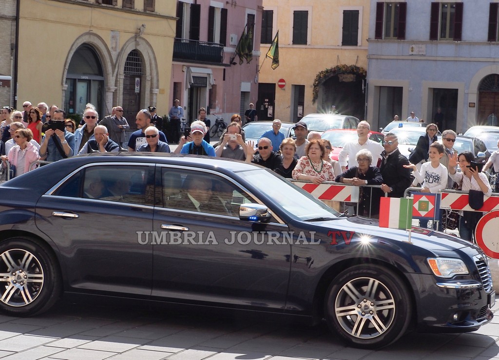 Il Capo dello Stato è giunto all’Auditorium San Domenico di Foligno alle 9 puntuali, come previsto dal cerimoniale, ed è stato ricevuto dalla presidente della Regione Umbria Catiuscia Marini, il sindaco di Foligno e Presidente della Provincia di Perugia Nando Mismetti, il presidente di Nemetria Giuseppe De Rita e la segretaria generale Laura Radi. Al Presidente è stato consegnato un piatto in ceramica con lo insegne della Città di Foligno, ed ha poi firmato il Libro della Città.