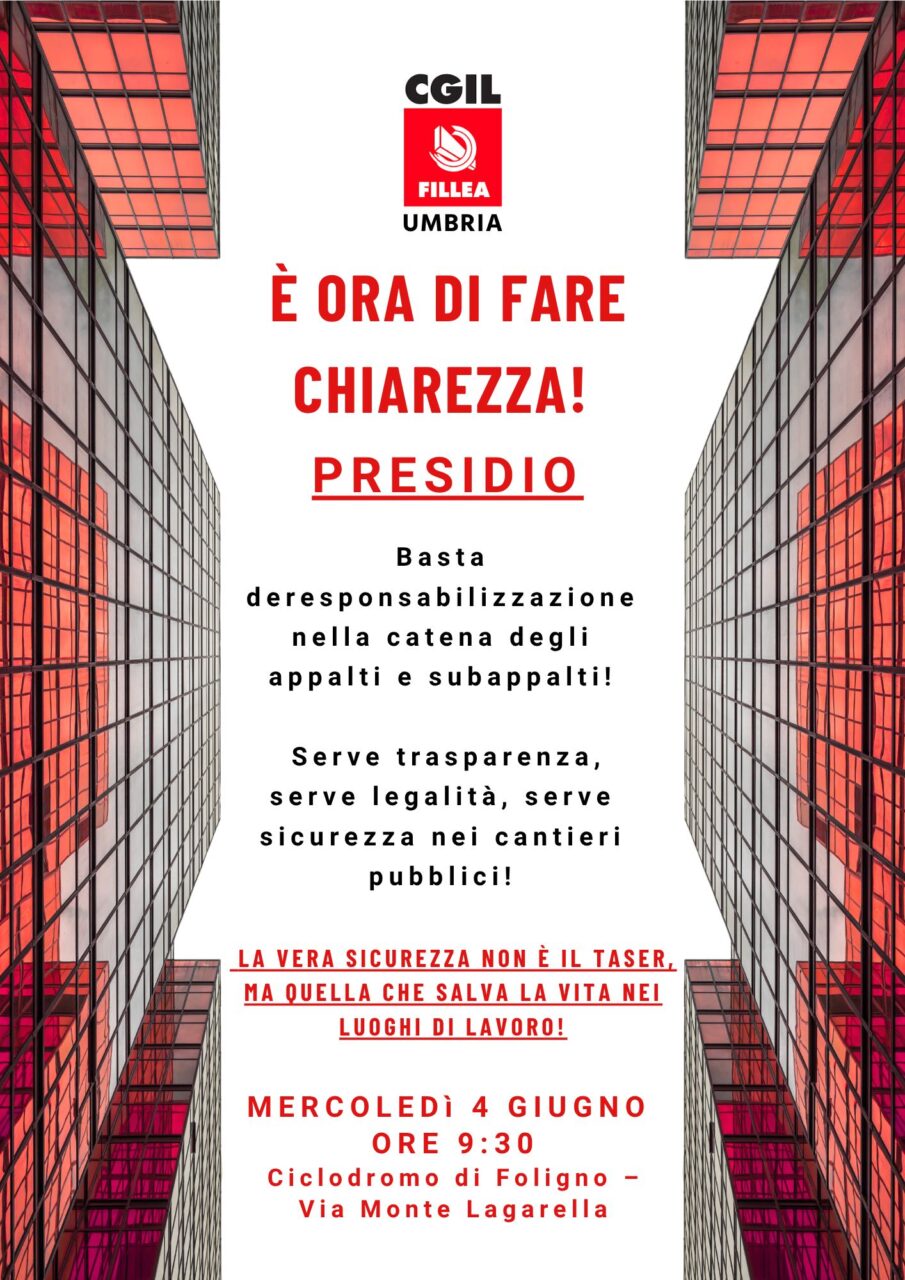 Foligno, 4 giugno- Domani, mercoledì 4 giugno alle ore 9:30, presso il Ciclodromo di Foligno (Via Monte Lagarella), la Fillea Cgil Umbria organizza un presidio per chiedere trasparenza, legalità e sicurezza nei cantieri pubblici.