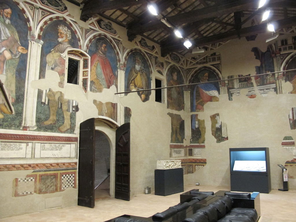 Inscritto al centro di ogni arcata, un grande della sua storia, mostrato a esempio di grandezza e di virtù. Gli affreschi sono stati recentemente assegnati a Gentile da Fabriano, grazie alla scoperta di un importante documento e datati 1411- 12. Il Palazzo è sede del Museo Archeologico e della Pinacoteca della città.