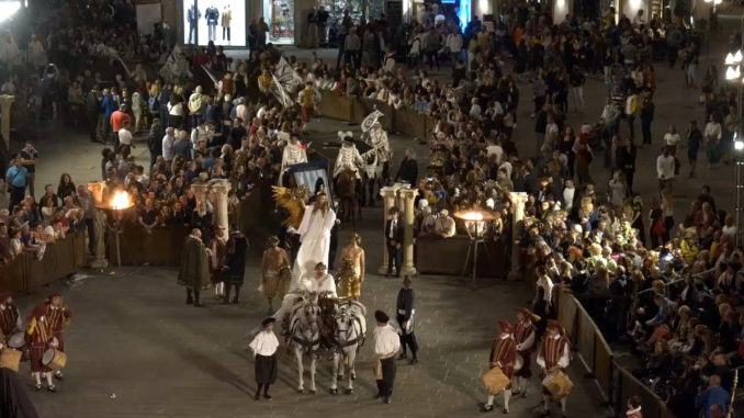 Il Corteo delle rappresentanze rionali prenderà ha preso il via alle 21.45 con partenza da piazza del Grano, per procedere poi in via XX Settembre, piazza San Giacomo, via Meneghini, largo Volontari del Sangue, via Gentile da Foligno, piazza Faloci Pulignani, largo Carducci, piazza della Repubblica, via Gramsci, piazza San Domenico, via Mazzini, Corso Cavour, via Oberdan, via Umberto I, via Garibaldi, largo Carducci e, di nuovo, piazza della Repubblica. Alle 23 la suggestiva cerimonia dell’Arruolamento dei cavalieri con l’estrazione dell’ordine di partenza per la Giostra di oggi e a chiudere la lettura del Bando di Giostra interpretato da Claudio Pesaresi.