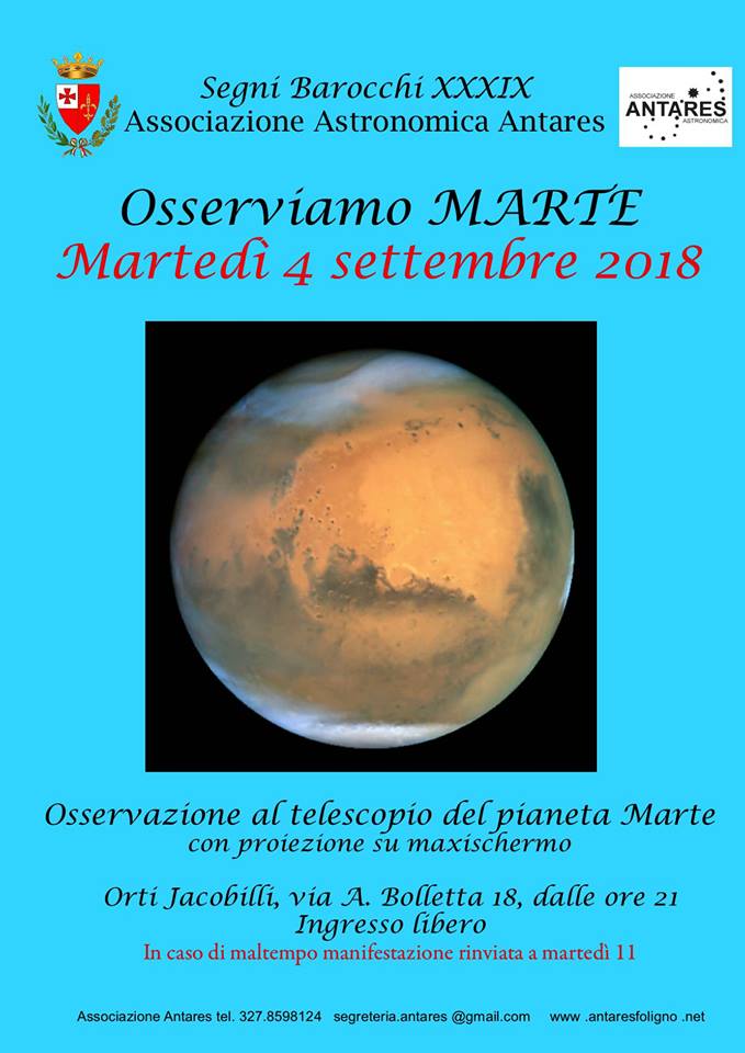 Segni Barocchi Festival, iniziativa associazione astronomica Antares L’associazione astronomica Antares proporrà martedì 4 settembre, alle 21, un’osservazione al telescopio del pianeta Marte nell’ambito delle iniziative di Segni Barocchi Festival. L’iniziativa, organizzata dal prof. Roberto Nesci, si svolgerà al Giardino degli Orti Jacobilli (in caso di condizioni meteorologiche sfavorevoli l’appuntamento sarà rinviato a martedì 11 settembre). Il 1600 è il secolo in cui nasce la scienza moderna, a cominciare dall’astronomia. Il 1672, in particolare, è l’anno in cui venne fatta la prima vera misura delle dimensioni del sistema solare, calcolando simultaneamente la posizione di Marte da Parigi (Francia) e da Caienne (Guiana Francese).