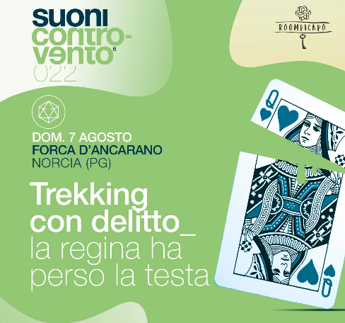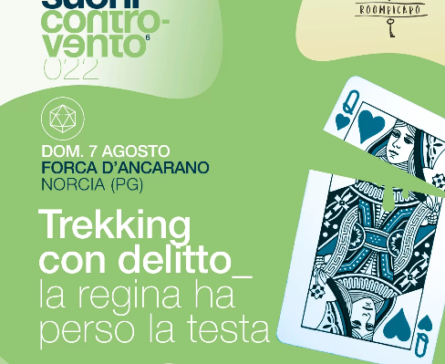 Domenica 7 agosto la kermesse si apre alle 16 a Forca d’Ancarano, a Norcia dove Roompicapo è pronta ad accogliere i fruitori con un originale trekking con delitto dal titolo La regina ha perso la testa. Un tranquillo trekking di divertimento si trasforma nuovamente nel teatro di un misterioso omicidio. Cos’è successo questa volta? Sfoderate il vostro intuito e catapultatevi nella foresta delle meraviglie alla ricerca degli stravaganti sospettati. Troverete i personaggi da interrogare disseminati lungo la camminata.