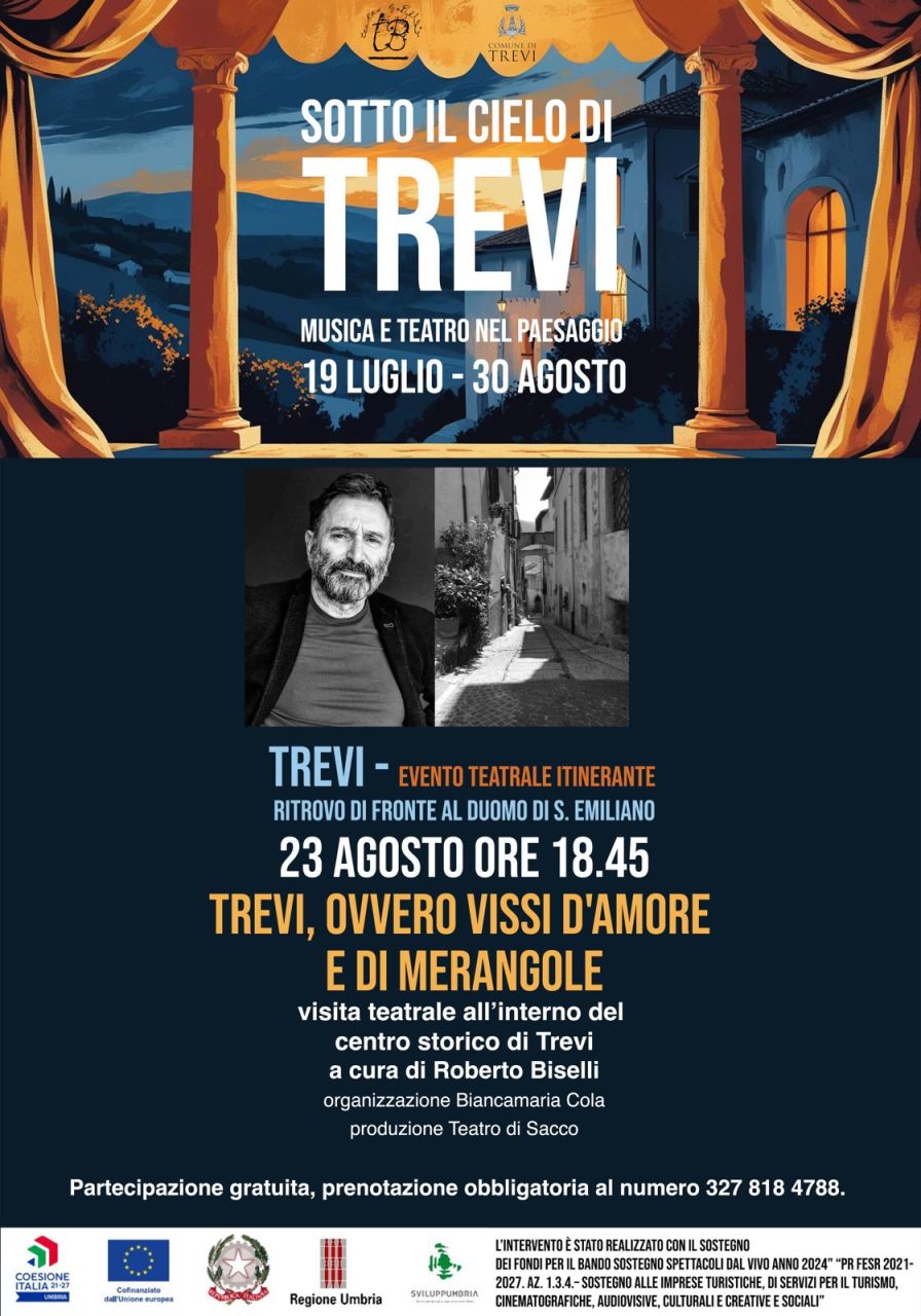 Il punto di ritrovo è di fronte al Duomo di Sant’Emiliano, da dove prenderà il via un itinerario culturale e teatrale di circa un’ora e mezza. A guidare il pubblico sarà l’attore e regista Roberto Biselli anima del Teatro di Sacco, che condurrà i partecipanti lungo le vie del centro storico di Trevi, uno dei tanti borghi belli dell’Umbria, attraverso narrazioni, aneddoti e racconti che si intrecciano con la storia e l’identità del luogo.